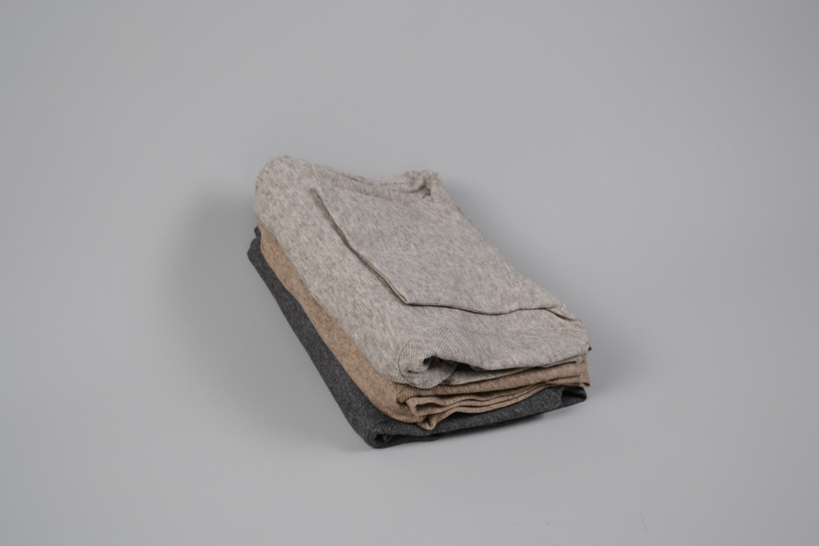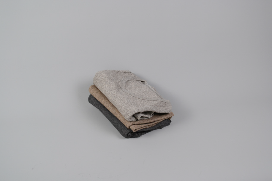 腹巻きの編み地を編むような、今では珍しい小口径の丸編み機で編み立てられています。ヤクのような獣毛が入った細い糸は力を加えすぎると切れ易く、機械を調整しながらスピードを落としてゆっくり編まねばなりません。袖口や襟ぐりにもフライス生地(リブ編み)を使用しているため、伸びやすいけれど、型崩れし難い。裾は天地始末という熟練の技術が必要な縫製を施しており、生地の繊細な柔らかさを保っています。素材、製造方法ともに、肌に一番気持ち良く寄り添うシャツを実現しています。