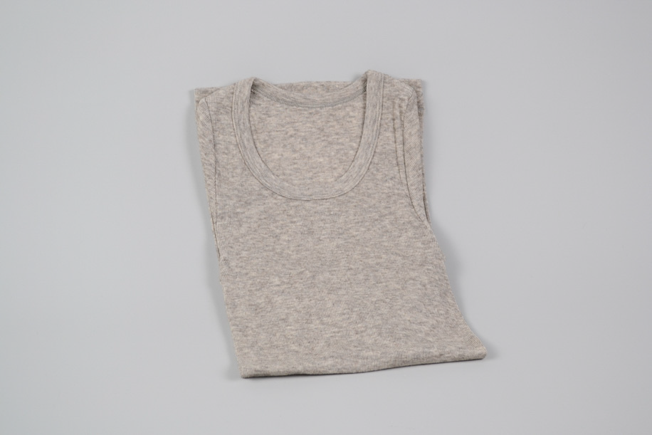 テレコという組織はリブ編みのひとつで、伸縮性に富んでいます。丸編み機で筒状に編まれた生地をそのまま身ごろにすることにより、脇に縫い目が無くなります。滑らかで肌触りの良い編み地は着用すると、からだ馴染みがとても良く、見た目にもすっきりと美しい。