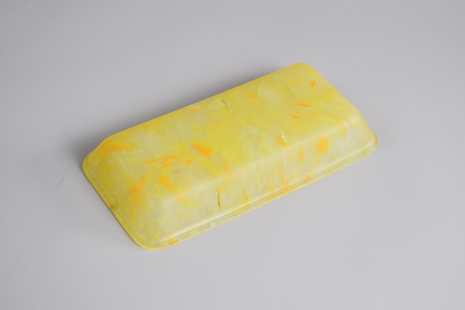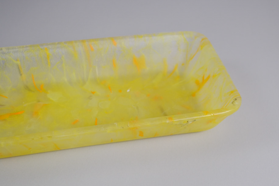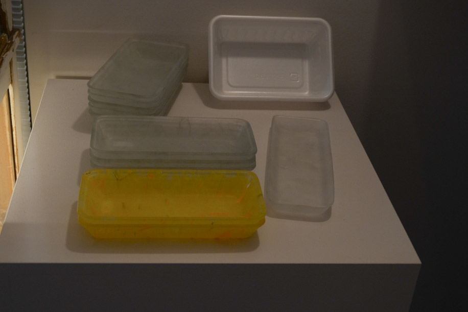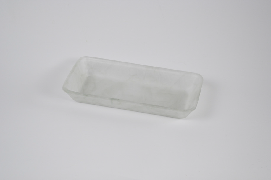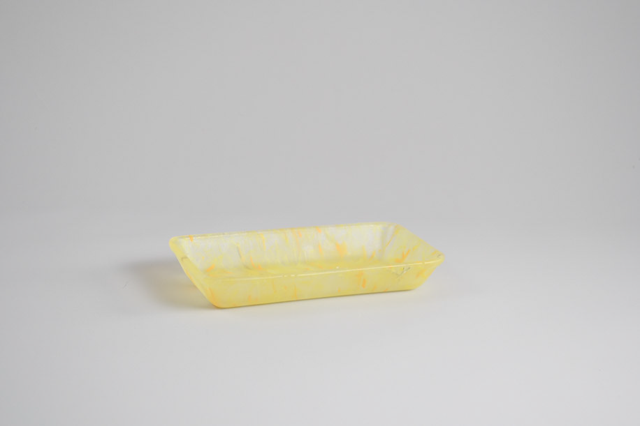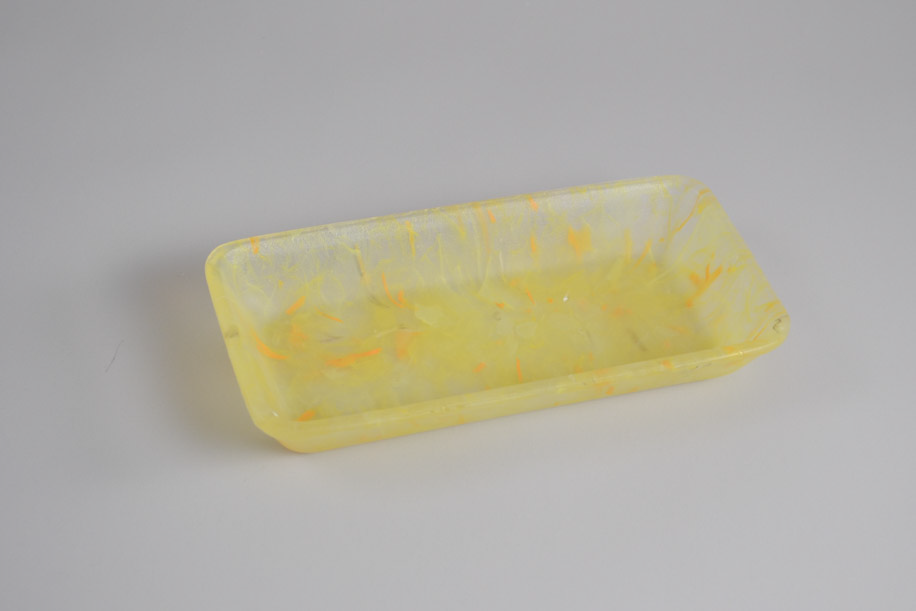 こちらは使い捨ての食品トレイをトレースした作品で、自身の失敗した作品を溶かし直し、リサイクルした「捨てられない食品トレイ」です。