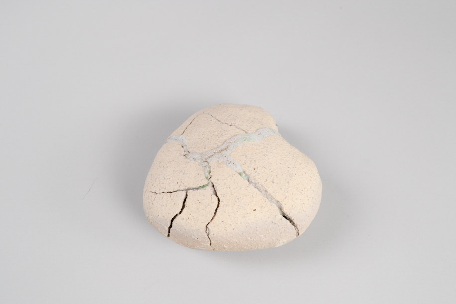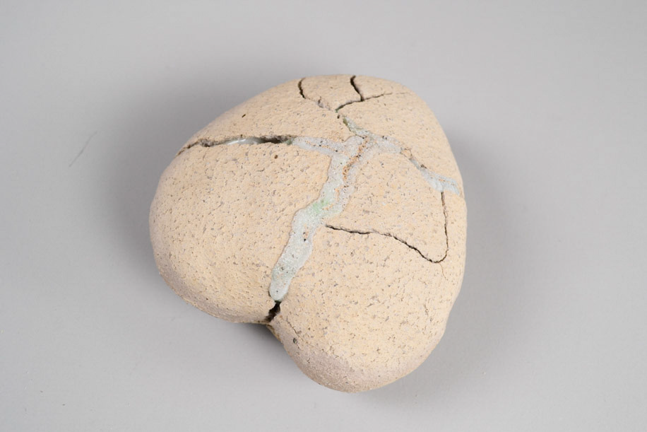 美濃の白原土、さまざまな釉薬でかたち作られたかたまり。心臓のかたちであるハート形をつい見つけてしまう習性がありますが、熱が加わり爆発しそうになったハートです。土と釉薬という素材がお互い拮抗しあって、ギリギリ耐えているのがニクイ。つまり、傷ついても壊れないハートなのです。