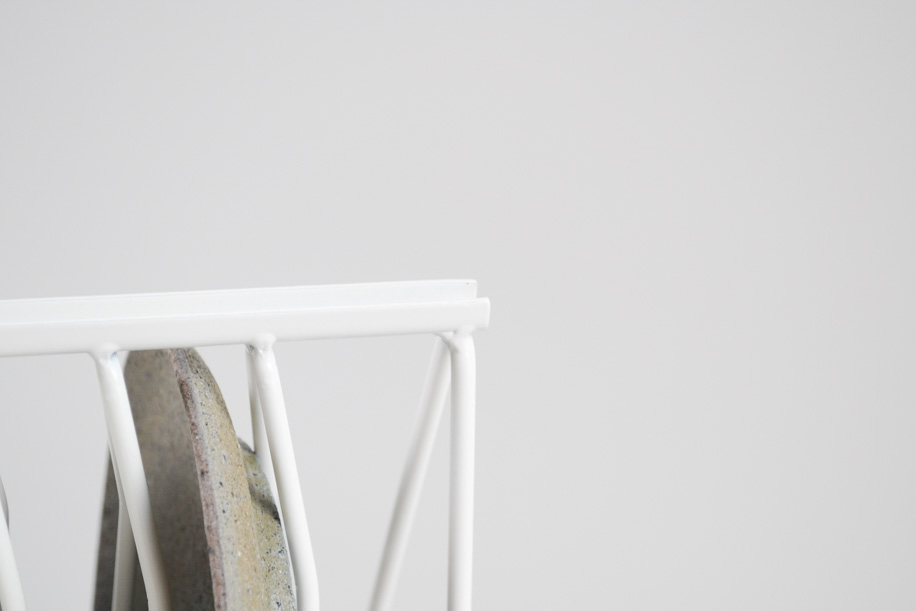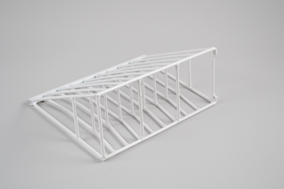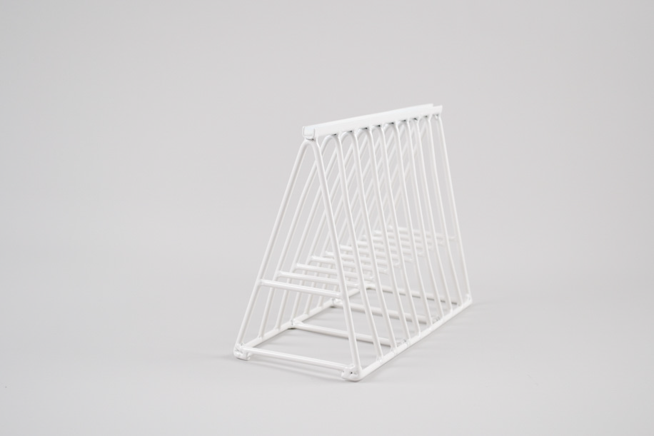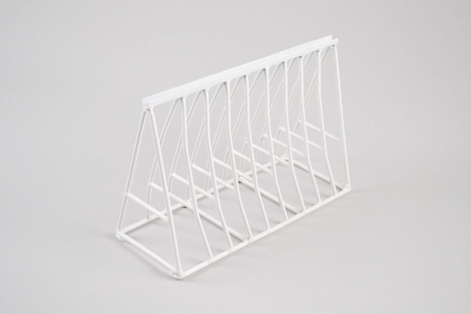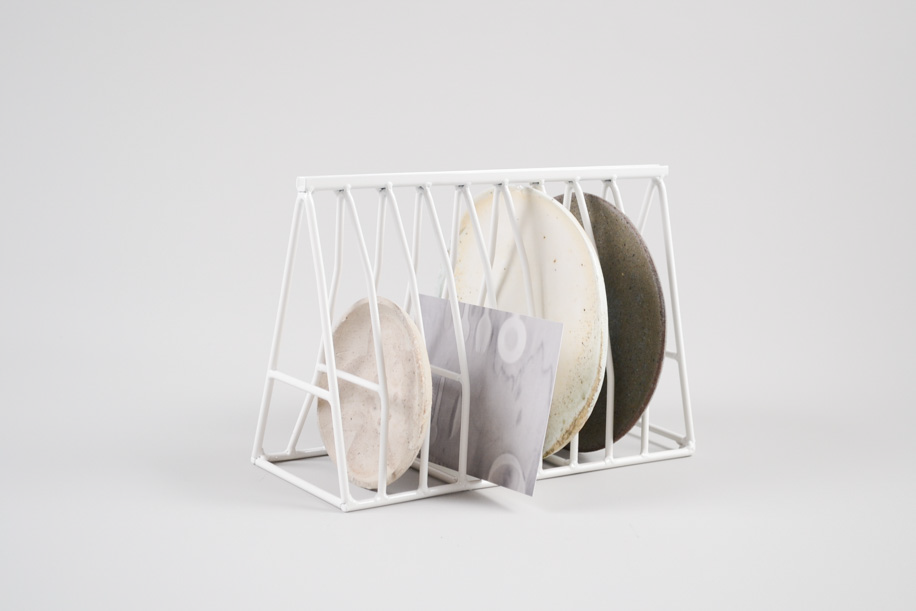 焼きものの窯道具。皿立てた状態で窯に入れる時に使用していたもの。芯は鉄ですが、ペイントして再生。ポストカードやお皿を立てられるようなスタンドとして利用できます。また、構造的に強度があるため、2つ利用して展示台の脚にすることも出来ます。
