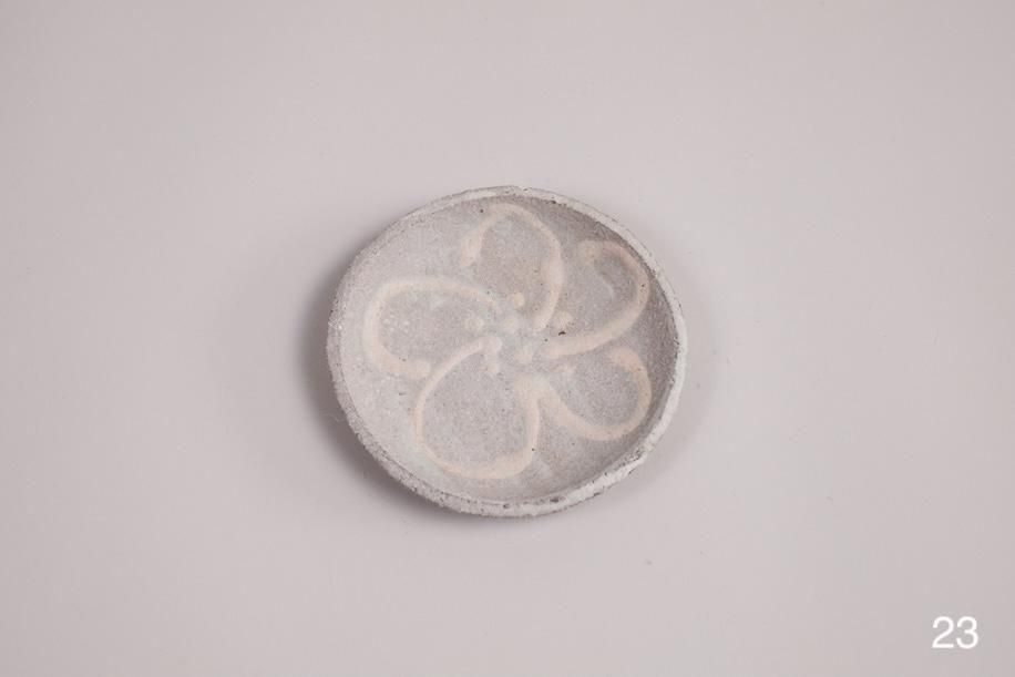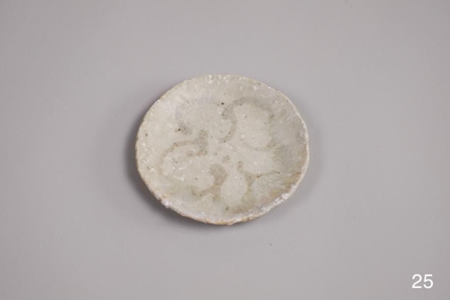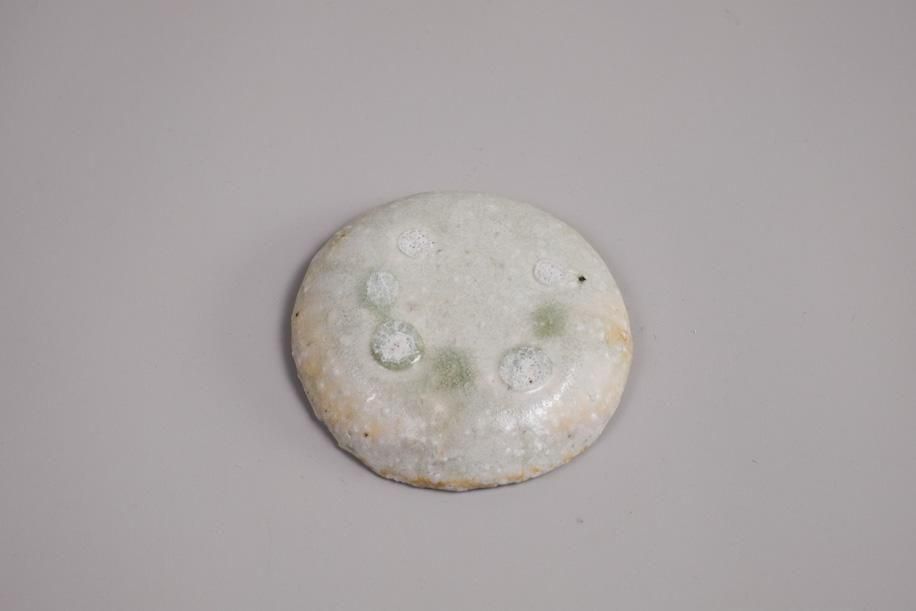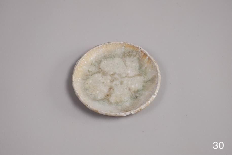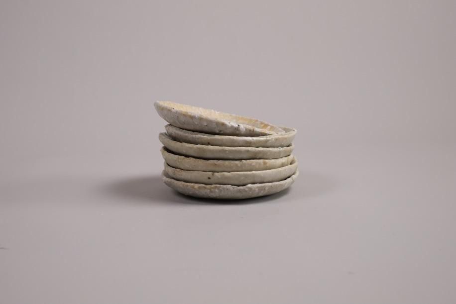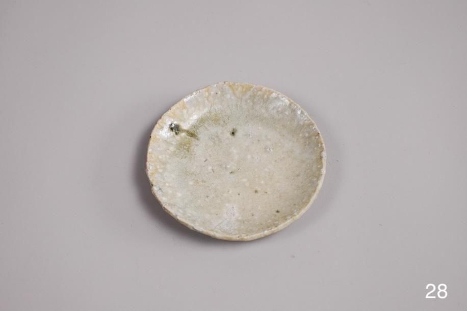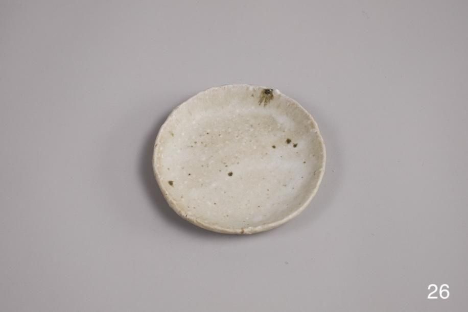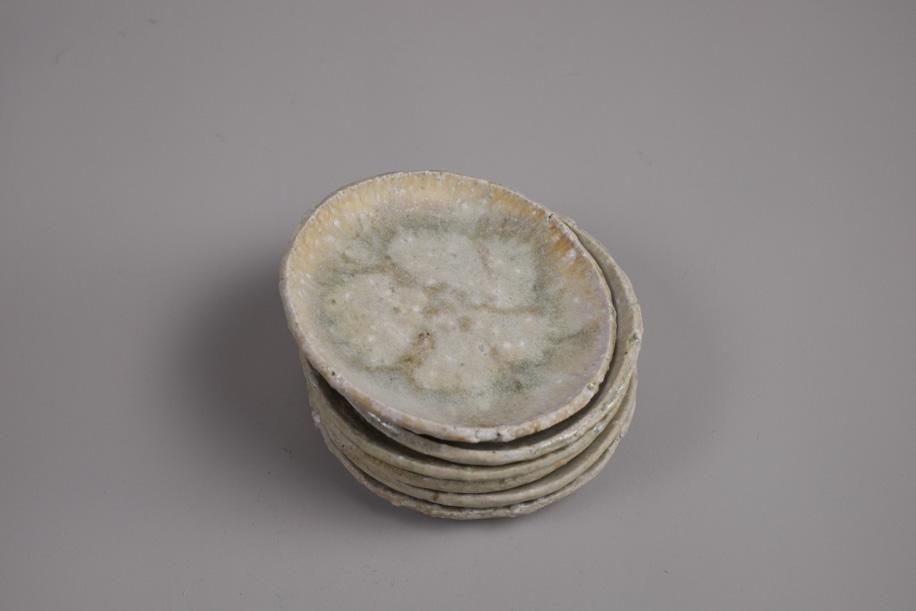 元々はテストピースのつもりで色々な土、釉薬、イッチンなど施してバラバラに制作したそうですが、見込みの平らな部分が多くて使いやすい。スパッと切ったような縁の厚み、立ち上がりも絶妙で好み。何かで型取ってる?って聞いたら意外なものでした。菓子皿サイズですが、茶托としておすすめ。