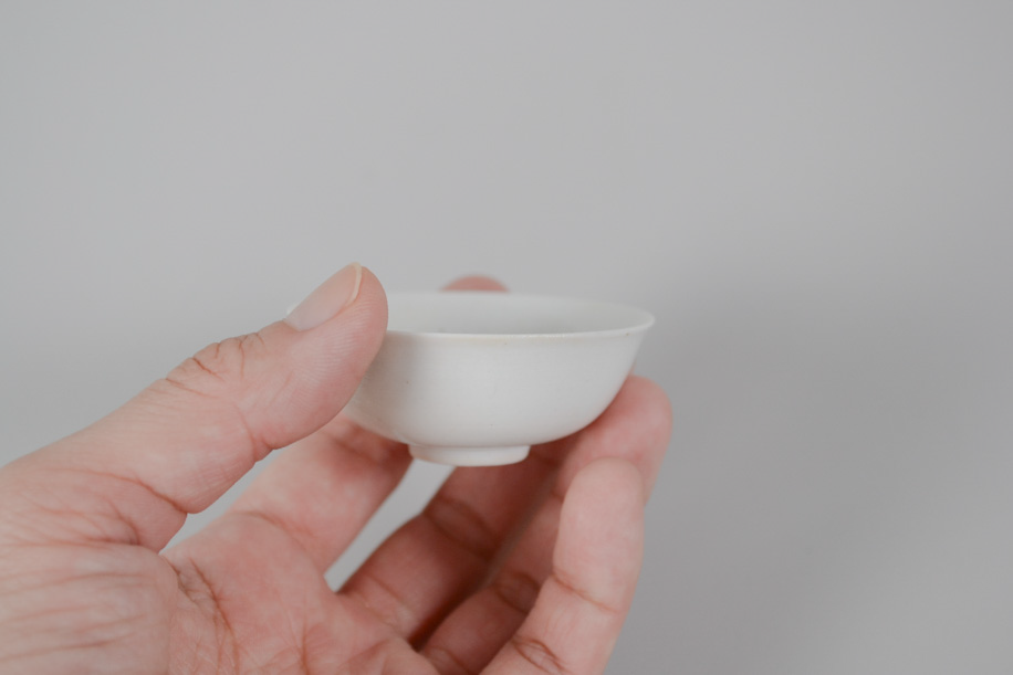 1980年代徳化窯のデッドストック。中華民国時代(〜1945)に徳化窯で焼かれていた古い茶杯をもとに復刻したもので、薪窯で焼かれています。非常に薄く、透き通るような白磁で、すっきりとした飲み口であることは言うまでもなく、心を奪われるようなハッとする美しい白。美味しいお茶を受け止めるに相応しい小さな小さな茶杯です。