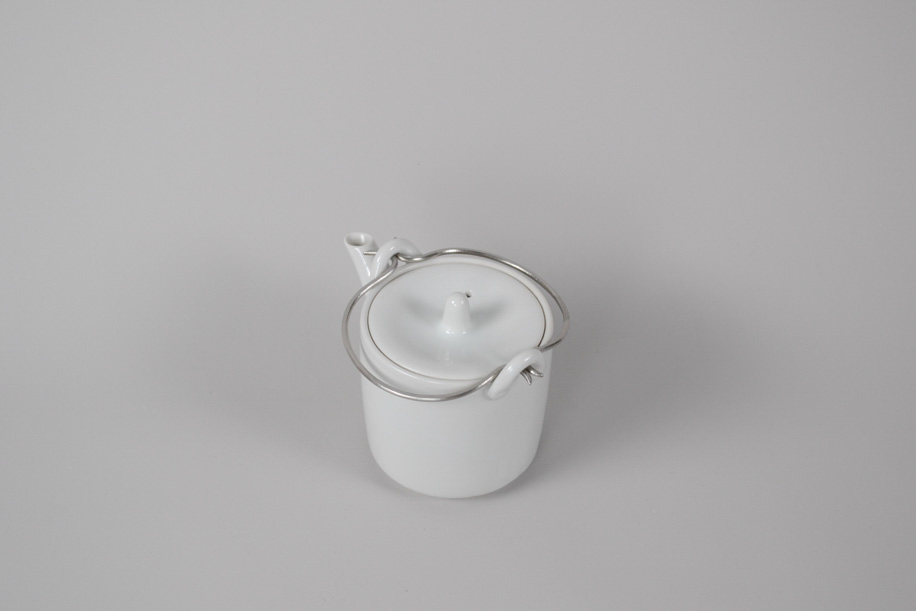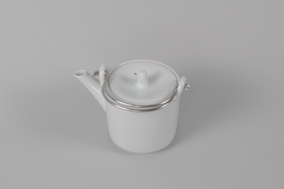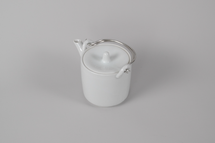 廃業したセトモノの工場から蔵出しになった白磁です。取手はちょうど注ぎ易い角度を保てる持ち手の長さやサイズを考慮し、ステンレスを手で叩いて製作しています。2本取りにすることにより安定感が増し、見た目もソー ソー ナイス。そしてボディにより添うように取手を寝かせて仕舞えるので場所を取らず収まり良も良いです。