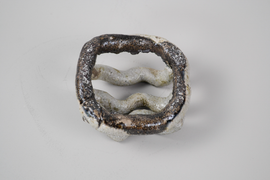 窯の中の酸素を奪い、高い温度・熱量を与えて焼き〆る、炭化焼き〆の技法で焼いています。小さな縁取りだけのバスケット。