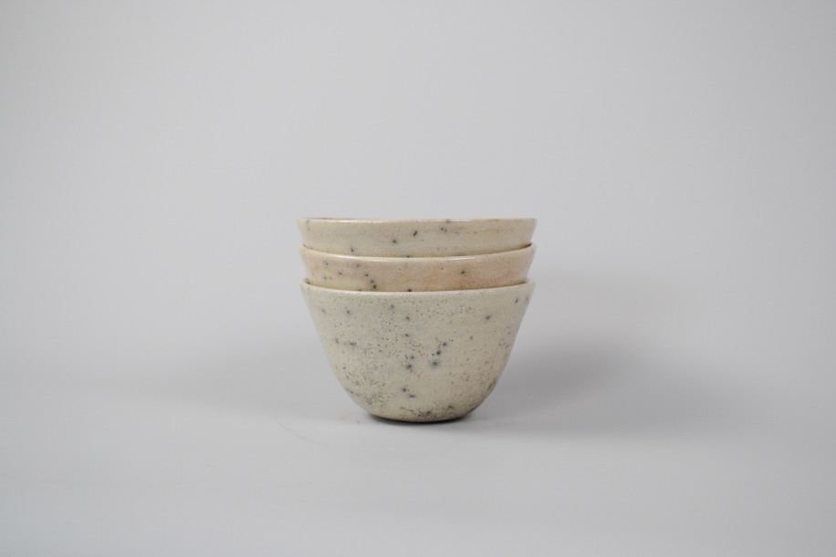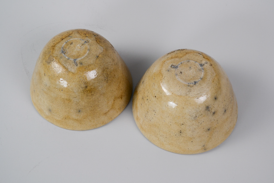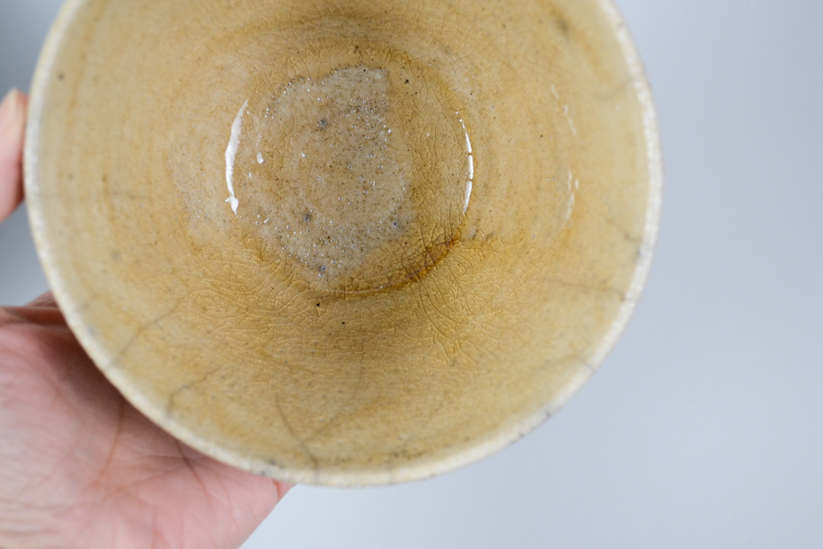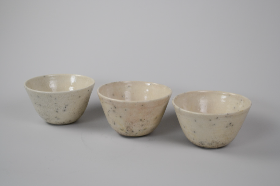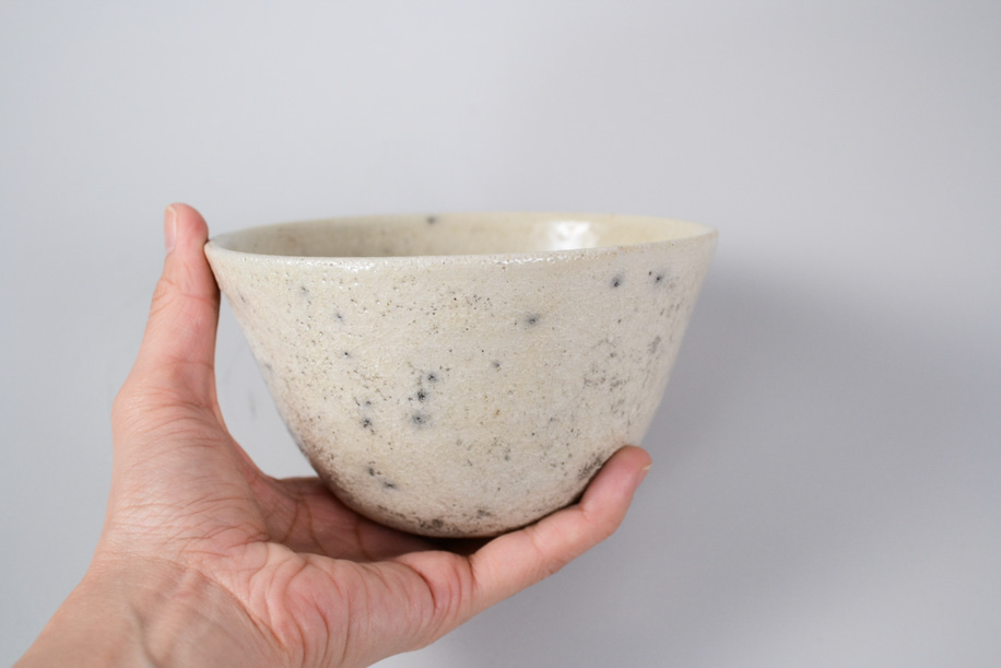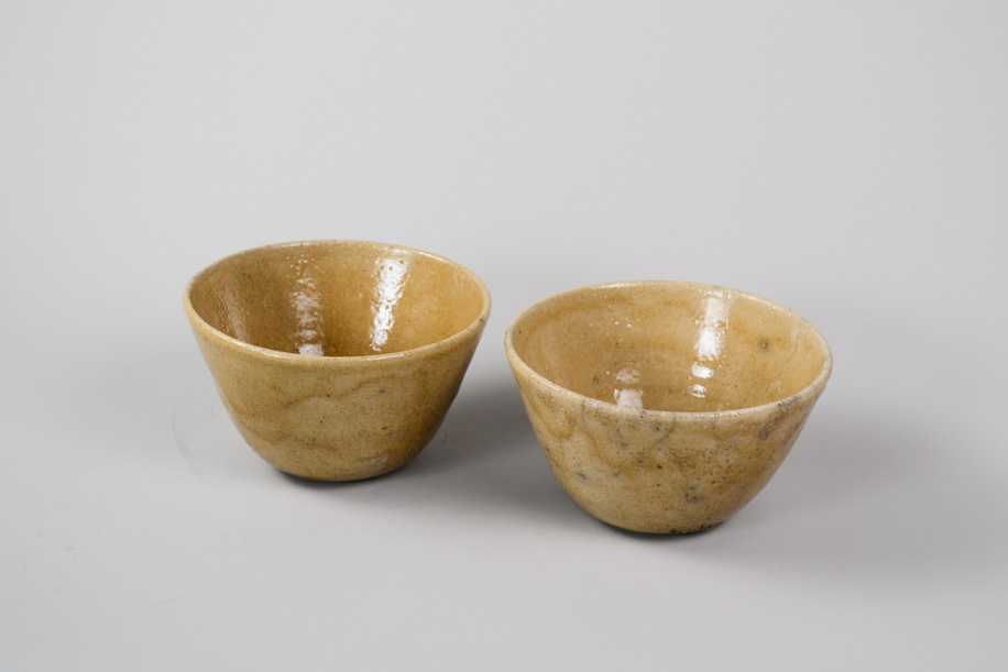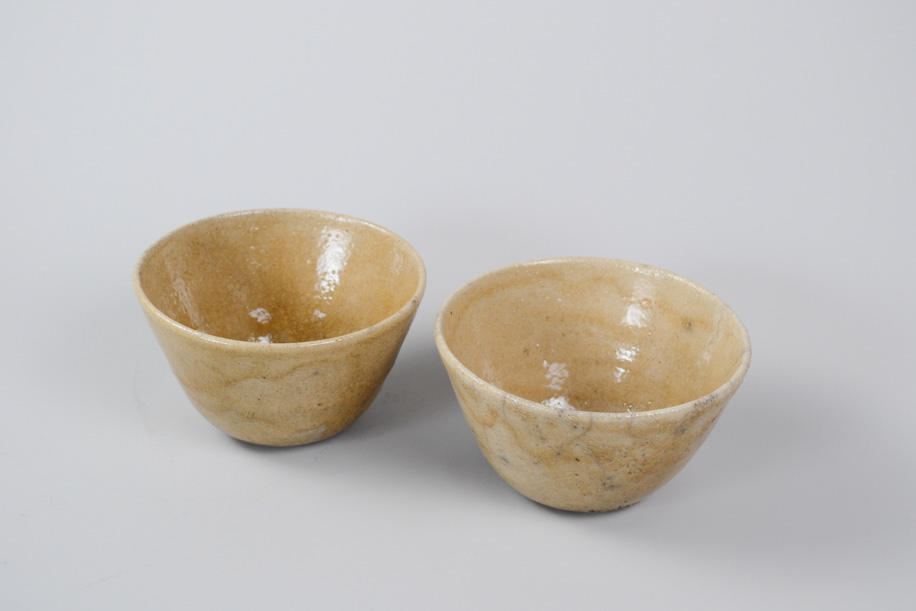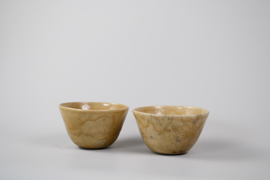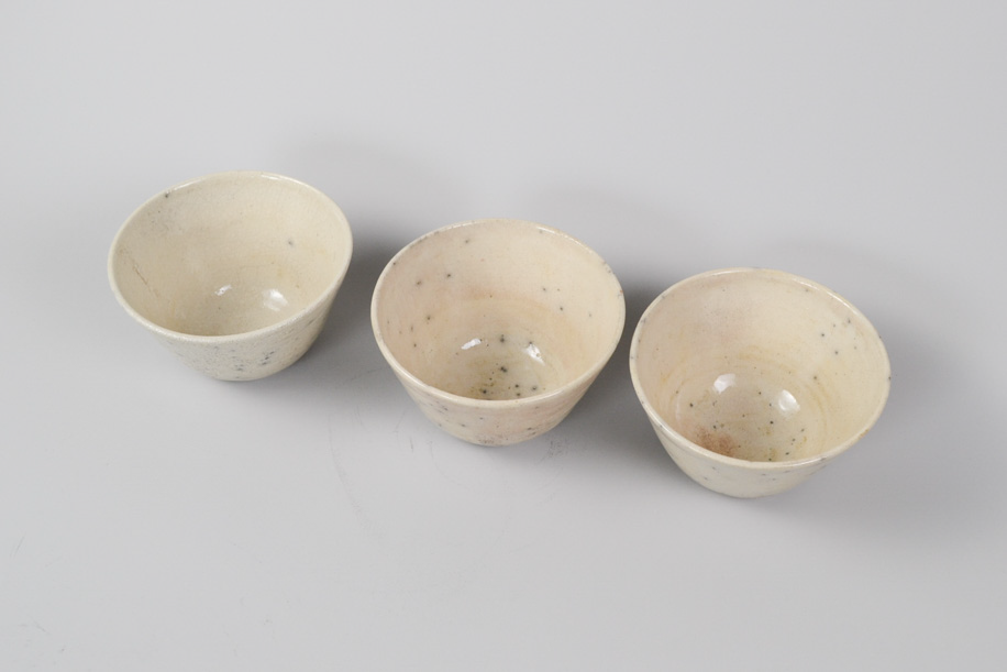 使用する灯油窯が小さいことからカップや豆皿などが多く、どれも生活に身近な愛らしい小作品。楽焼は窯から出してすぐ急冷しますが、その際に新聞紙を使うことから黒く貫入が入ります。一点一点違うことは前提として、ここでは同じようなサイズ感、色調のものをご紹介いたします。アソートになりますので、ご了承のうえお申し込みください。