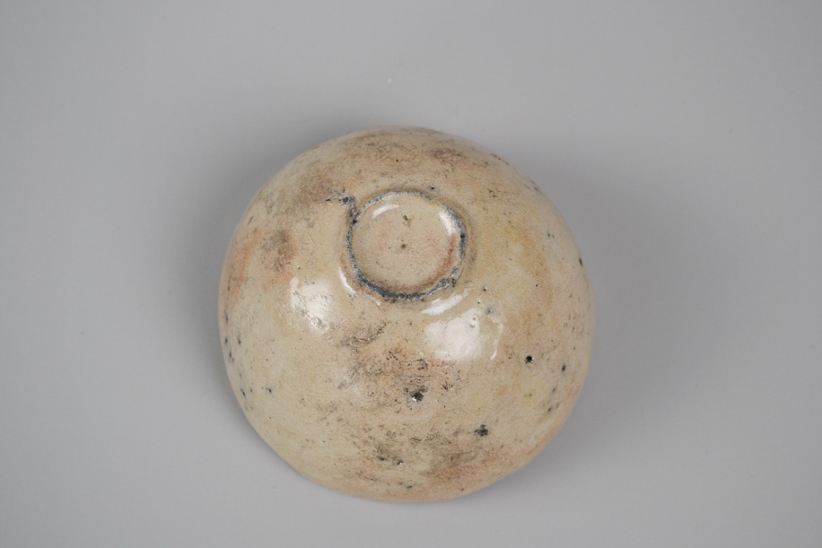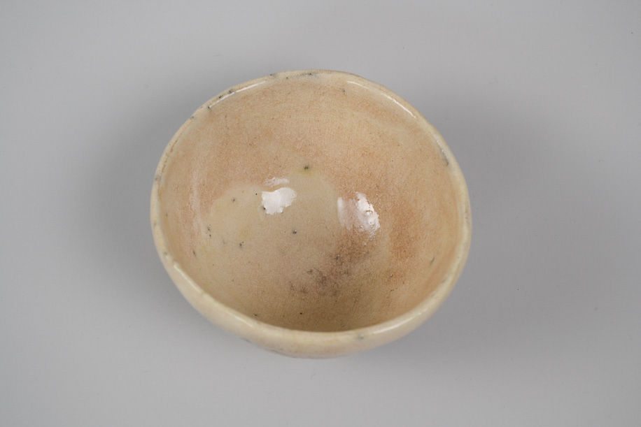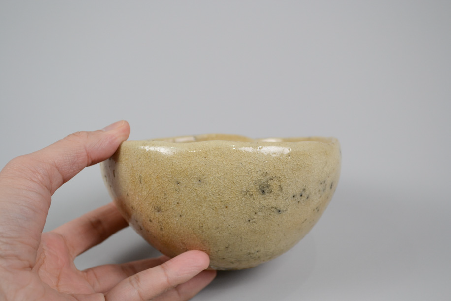 こちらはタタラ成形の碗。粘土の塊を手で叩き、伸ばしたものを型の上に被せてかたちを作り、仕上げています。轆轤のボウルよりも厚みがあり、手捻りのような佇まい。一点一点向き合って制作しており、手に抱いた時に、よりずっしりと存在感を感じられる作品です。