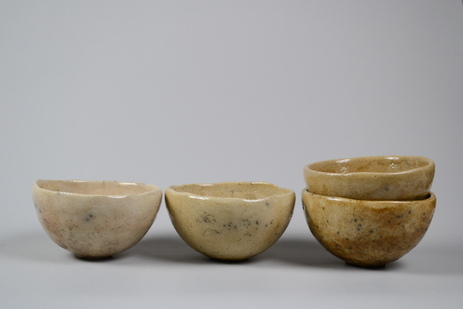 どれ一つとして同じものはない、楽焼の作品。低下度で焼いた土に、90%はガラス質だという釉薬。器でありながら、柔らかいものを硬くコーディングしたような、素材の塊を抱いているような不思議な気持ちになります。