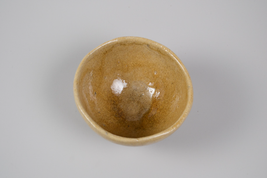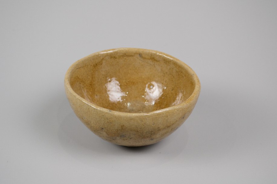 使用する灯油窯が小さいことからカップや豆皿などが多く、どれも生活に身近な愛らしい小作品。楽焼は窯から出してすぐ急冷しますが、その際に新聞紙を使うことから黒く貫入が入ります。