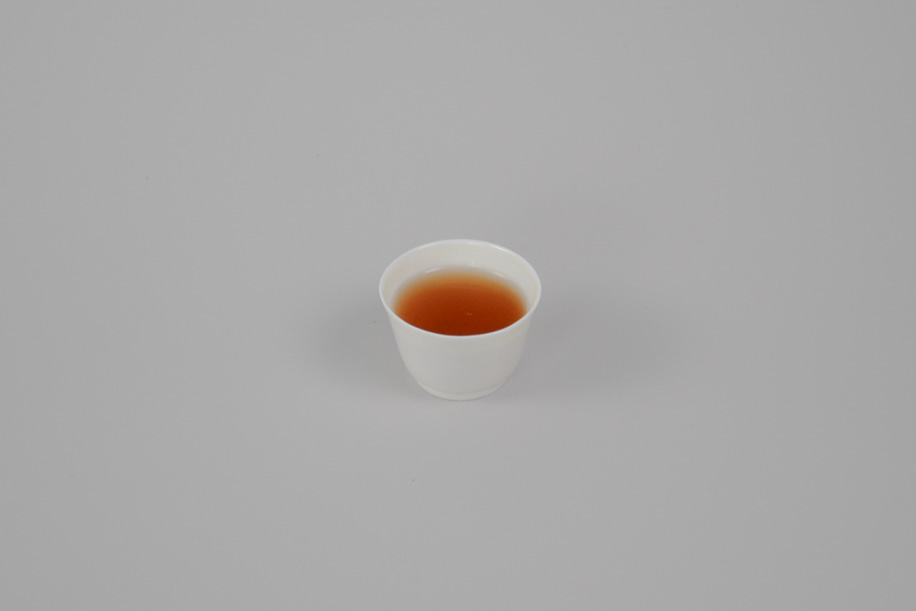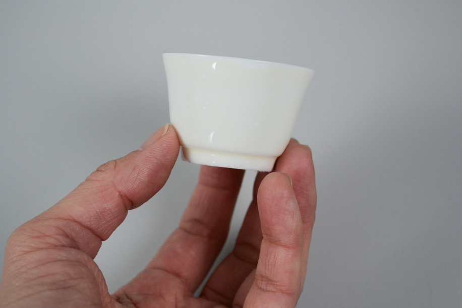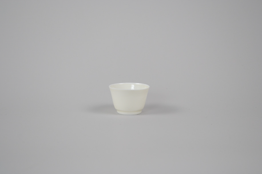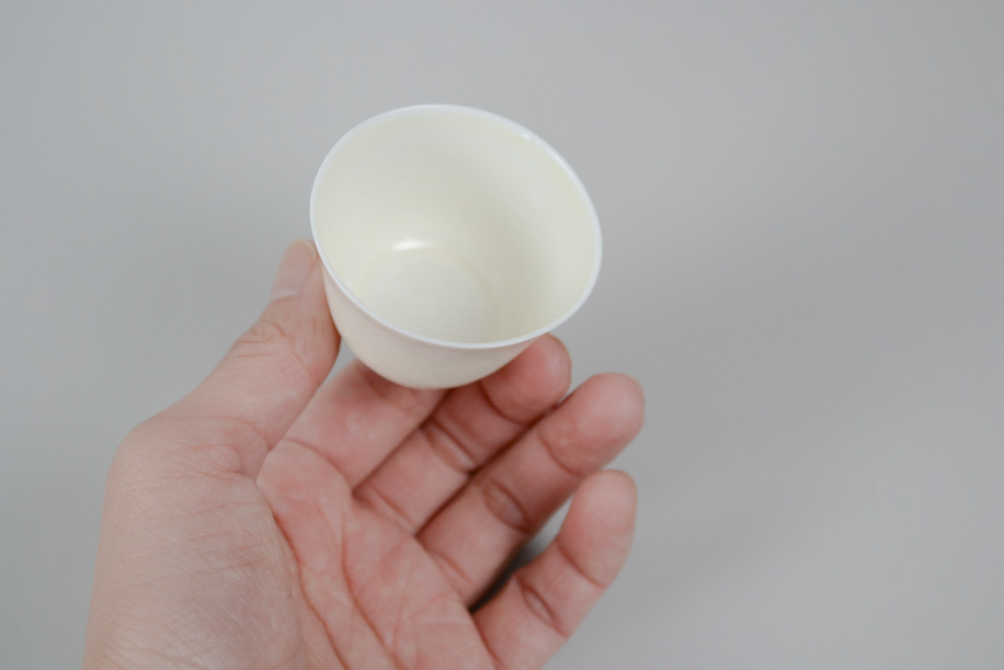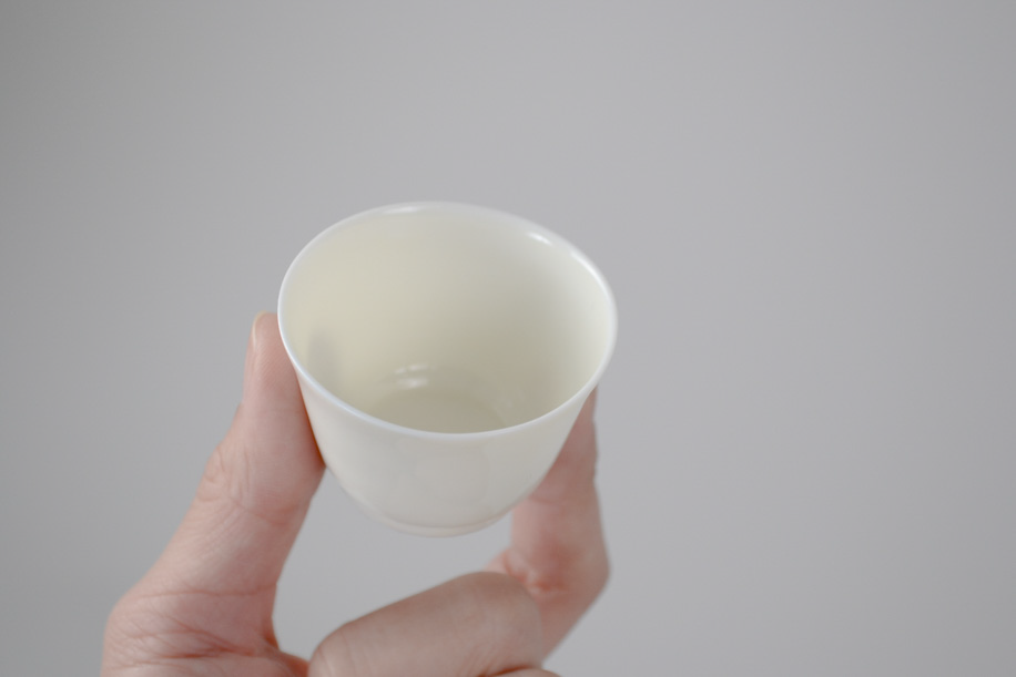 薪窯で焼かれた型ものの非常に薄手の白磁。極薄のためゆらゆらとした揺らぎのある肌が魅力的な白磁で、透かすと透けるほど透明度の高い土です。すっきりとした飲み口で、繊細にお茶を楽しむための茶杯の中の茶杯といった感じ。