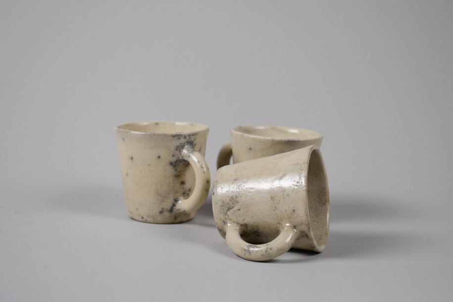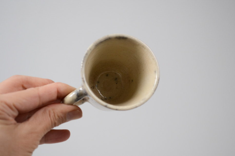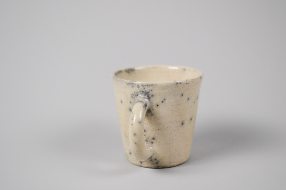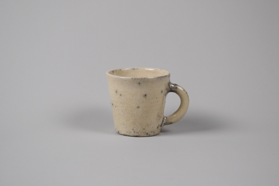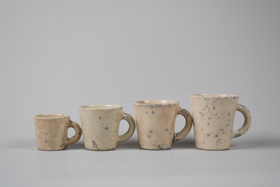 使用する灯油窯が小さいことからカップや豆皿などが多く、どれも生活に身近な愛らしい小作品。楽焼は窯から出してすぐ急冷しますが、その際に新聞紙を使うことから黒く貫入が入ります。一点一点違うことは前提として、ここでは同じようなサイズ感、色調のものをご紹介いたします。アソートになりますので、ご了承のうえお申し込みください。