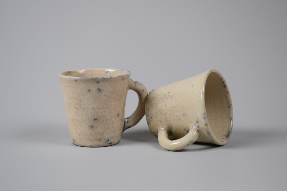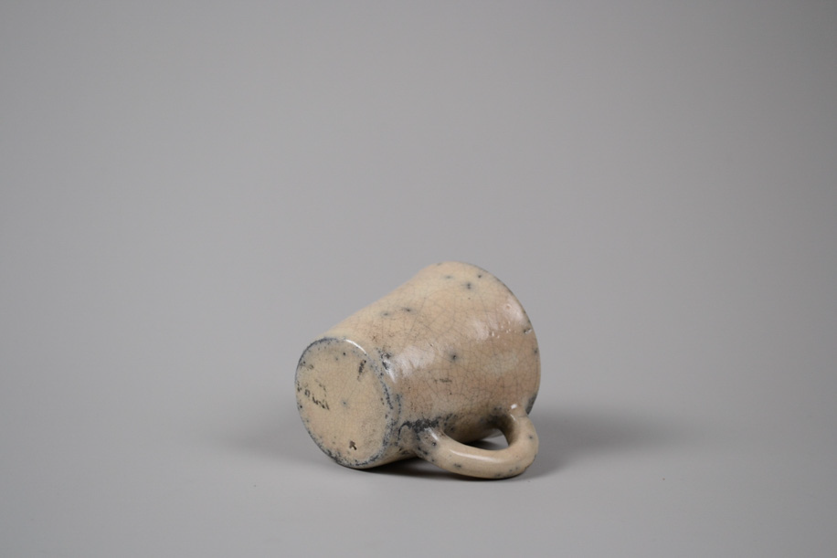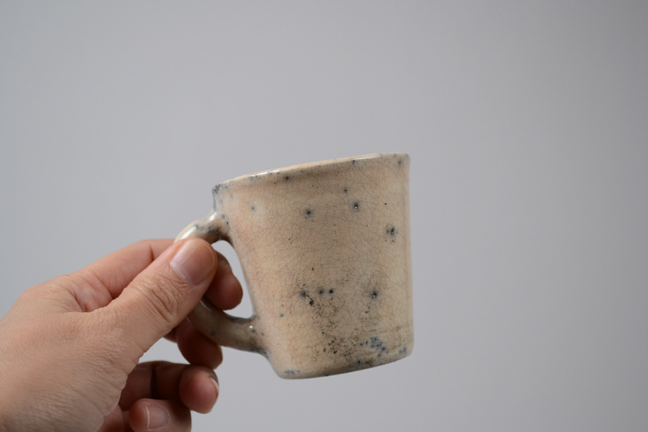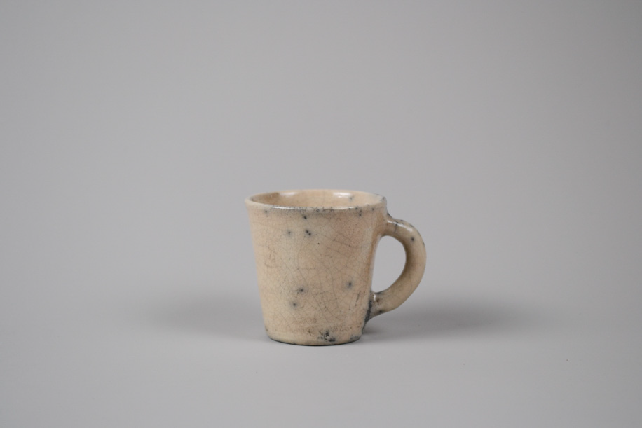 使用する灯油窯が小さいことからカップや豆皿などが多く、どれも生活に身近な愛らしい小作品。楽焼は窯から出してすぐ急冷しますが、その際に新聞紙を使うことから黒く貫入が入ります。一点一点違うことは前提として、ここでは同じようなサイズ感、色調のものをご紹介いたします。アソートになりますので、ご了承のうえお申し込みください。