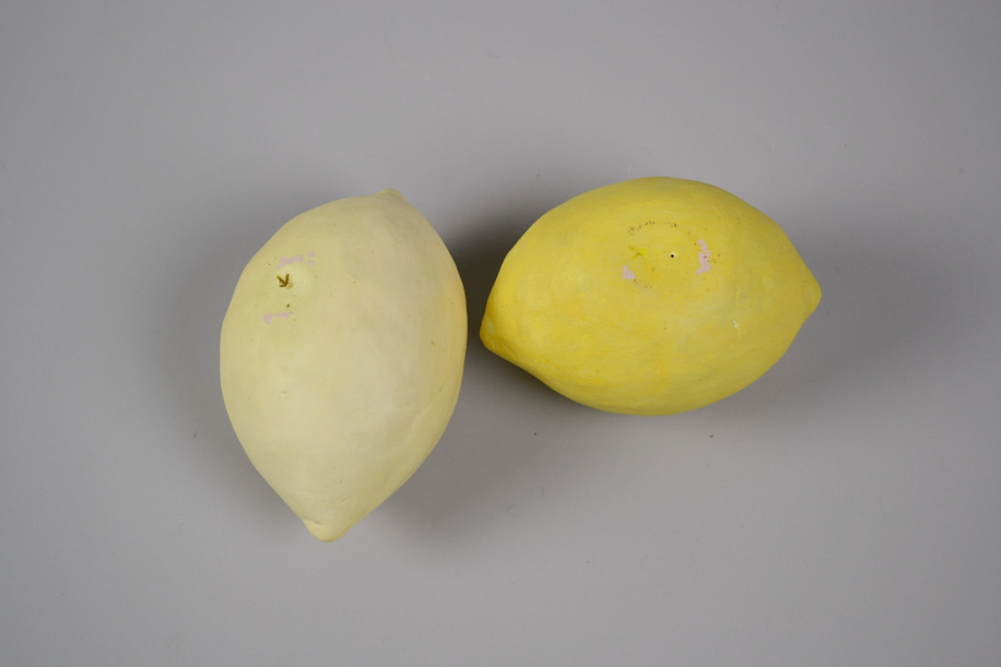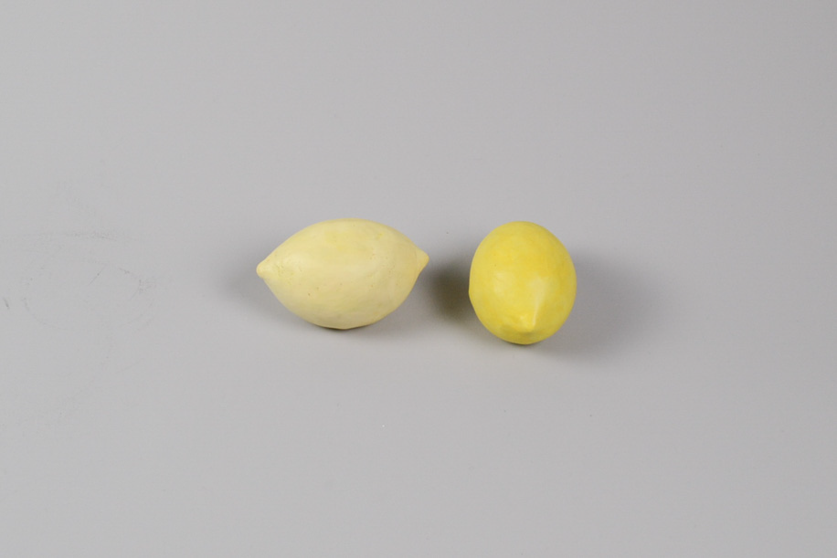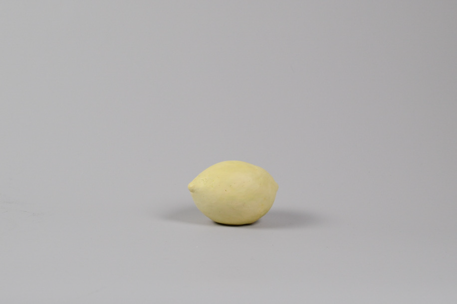 こちらは唯一、楽焼ではなく素焼きして絵の具、オイルクレヨンで彩色したもので、自立するように上下が決まった檸檬としてのかたち。キャンバスから飛び出してきたような檸檬で、今までの器とはまったく違うのに、なぜか黒畑さんらしいかたちと色、サイズだと感じます。