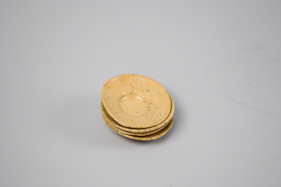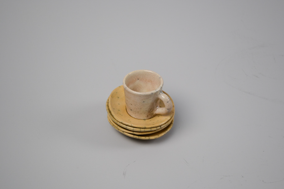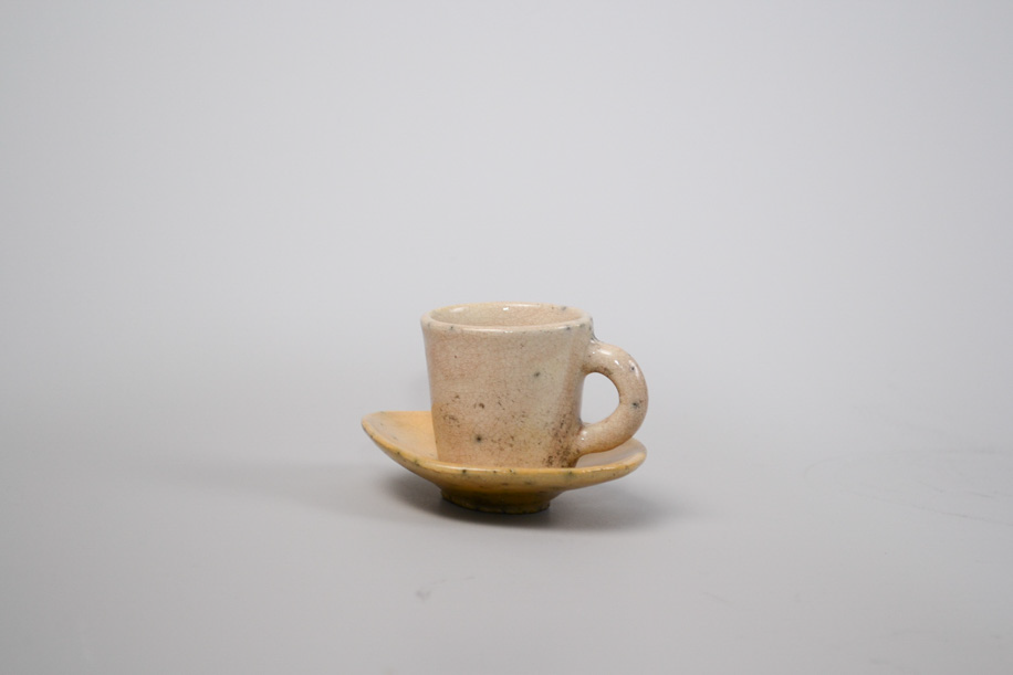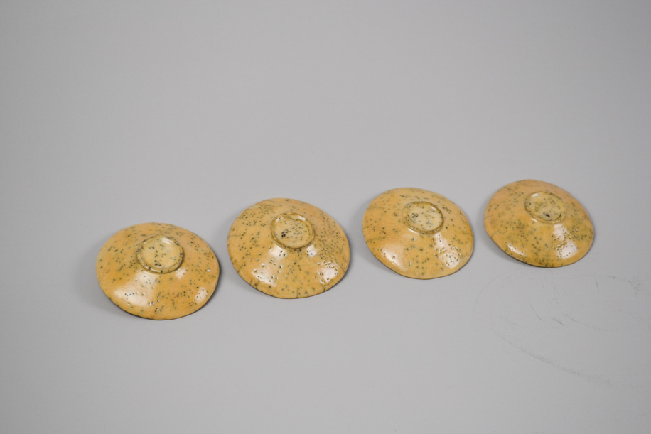 使用する灯油窯が小さいことからカップや豆皿などが多く、どれも生活に身近な愛らしい小作品。楽焼は窯から出してすぐ急冷しますが、その際に新聞紙を使うことから黒く貫入が入ります。一点一点違うことは前提として、ここでは同じようなサイズ感、色調のものをご紹介いたします。アソートになりますので、ご了承のうえお申し込みください。