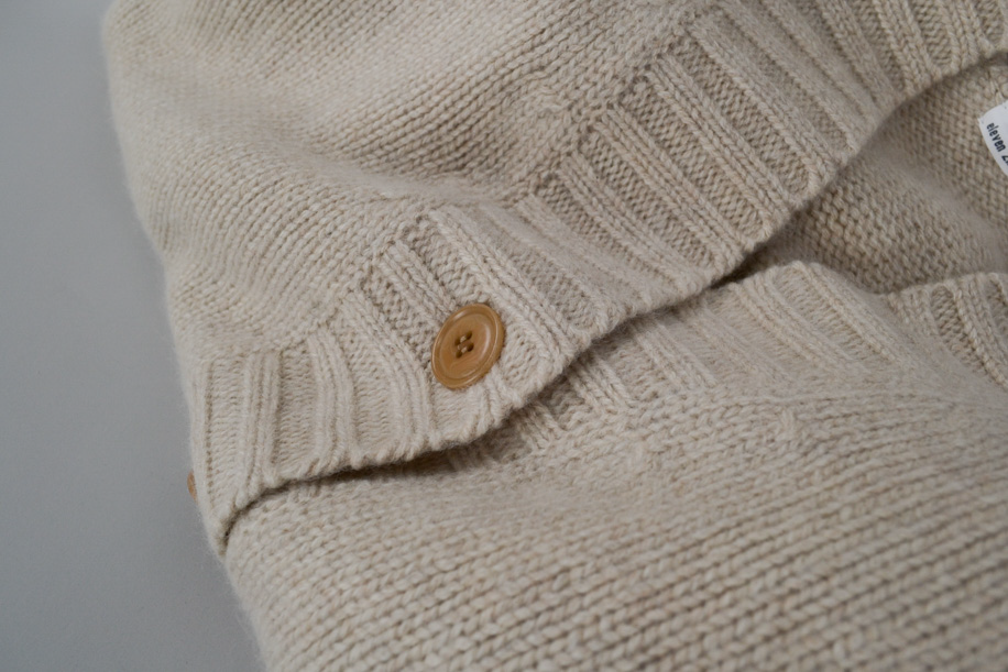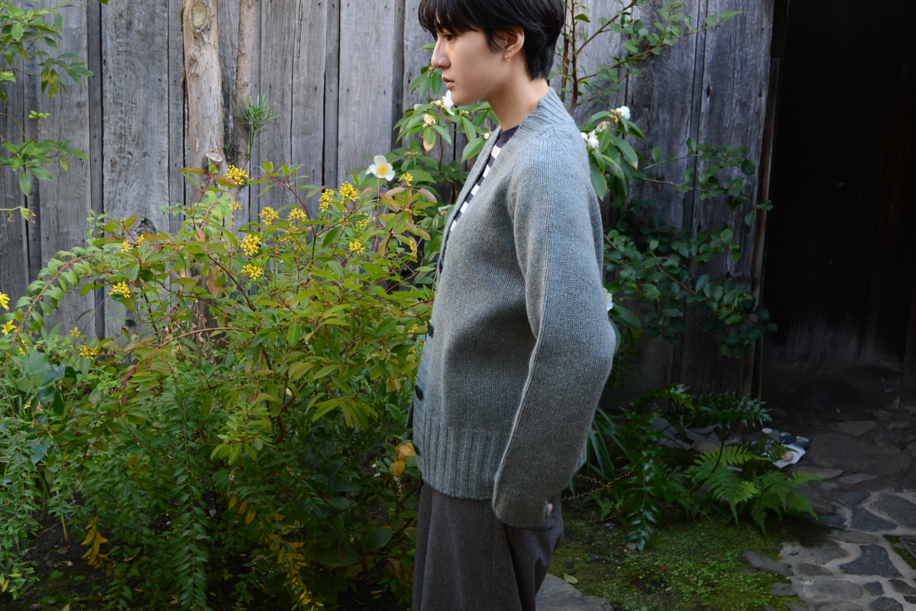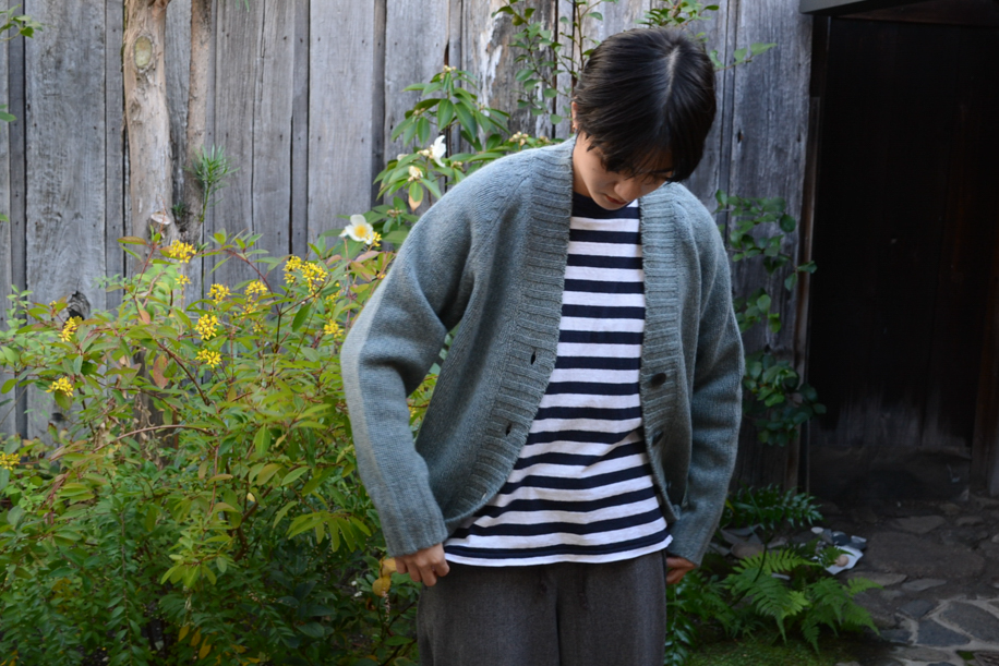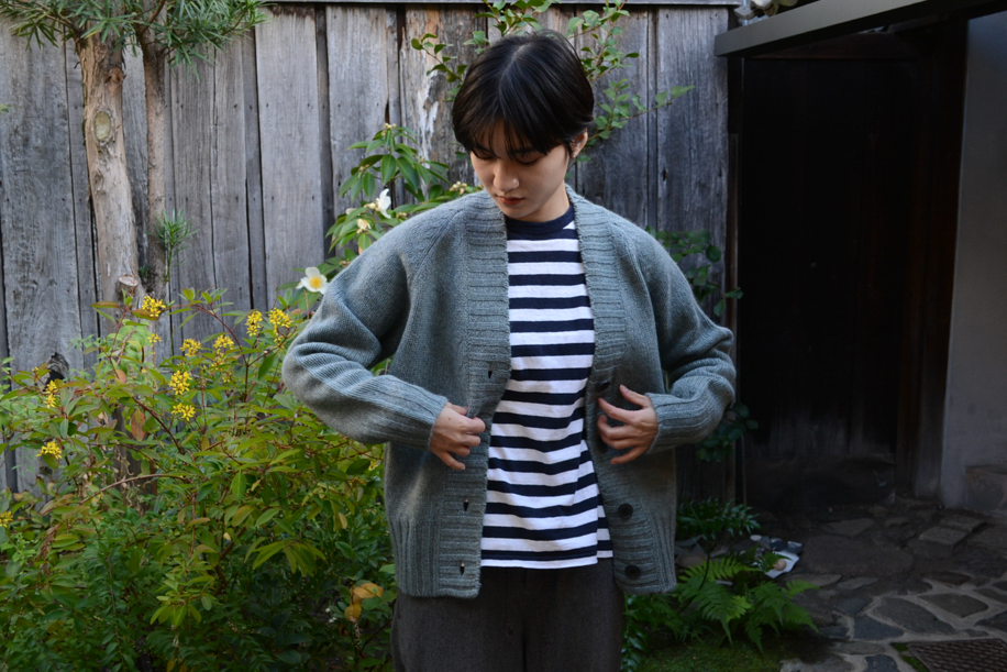Tシャツにさらっと1枚羽織るのも良いですし、冬の間長く着れるカーディガンです。大きめの樹脂ボタンともときめく組み合わせ。