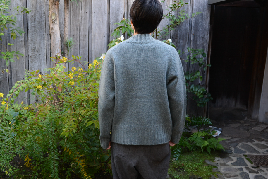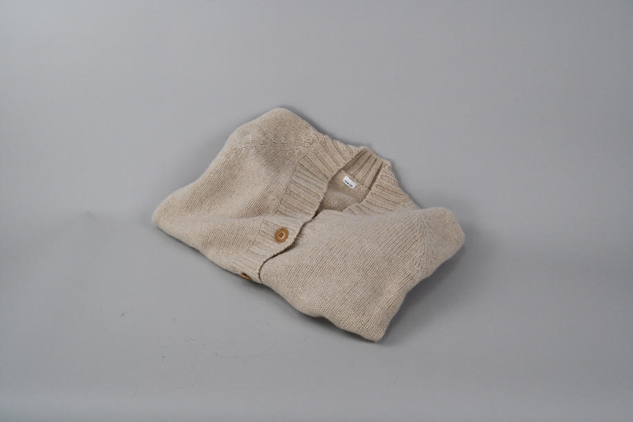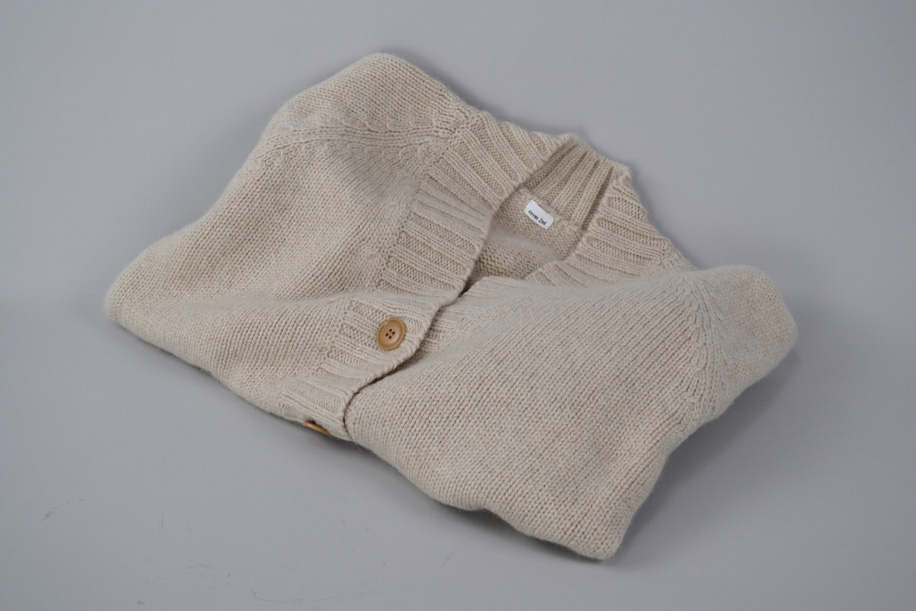 このカーディガンは二つの糸を撚糸して編まれているため、ハーフアンドハーフで二つの特性を良いとこ取りしたニットです。