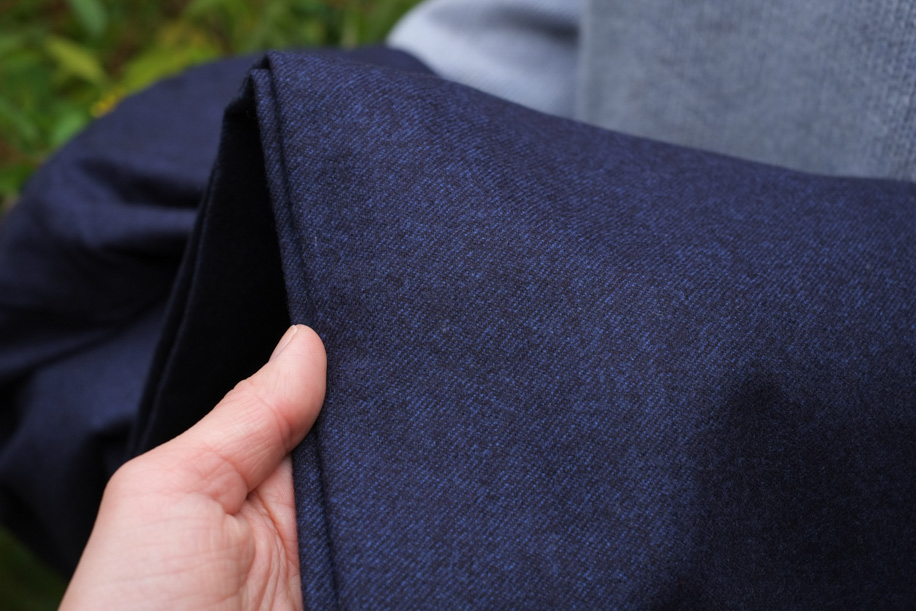 ブルーがかった深い紺色です。黒い服が多い方にも相性が良いです。紳士服の服地のようなハリ、艶がありかたちが綺麗にきまる素材です。