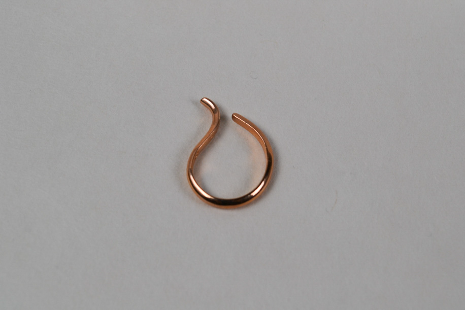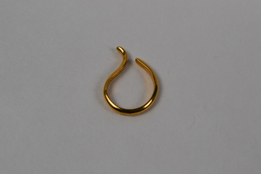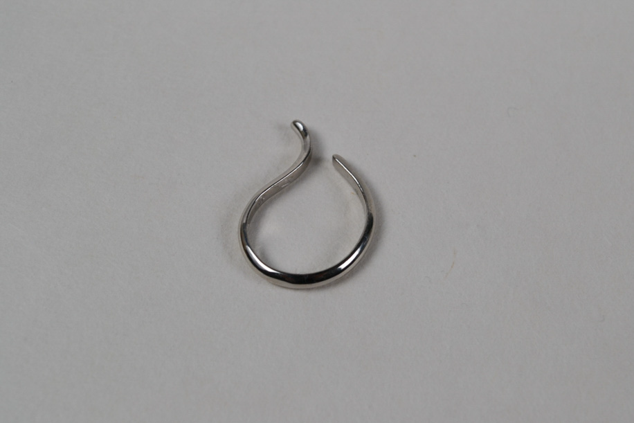 ・カフの開きは3〜4mmですが、多少は指で広げたり狭めたりすることが可能です。耳の薄い方は多少狭めて、落下しないようにします。反対に耳の厚めの方は少し広げます。ただし、狭めたり広げたりは耳に合わせるための初回の1回限りにして下さい。着用するたびに繰り返すと、金属疲労により破損の可能性があります。また型崩れもし易くなりますのでご注意下さい。基本はサイズ調整は行わずにこのままご使用いただくことをお薦めいたします。