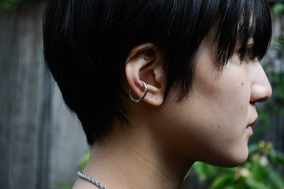 着用方法:耳の上部を指で少し引っ張りながら、イヤーカフをゆっくりと差し入れ、そのまま下部へ動かします。カフの開きは3〜4mmですので耳下部から落下することはほぼありません。外すときは、耳上部を引っ張りながら上部へ移動して外します。