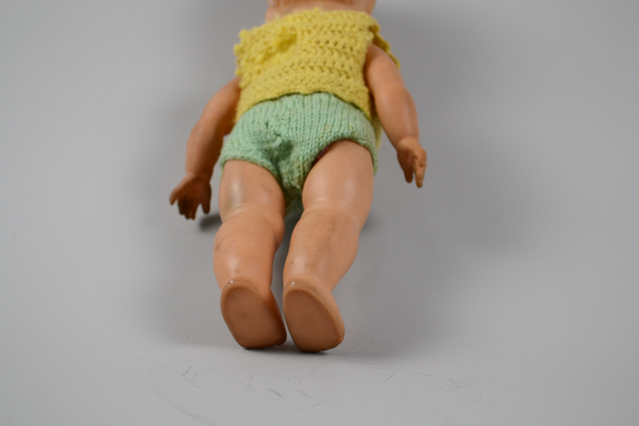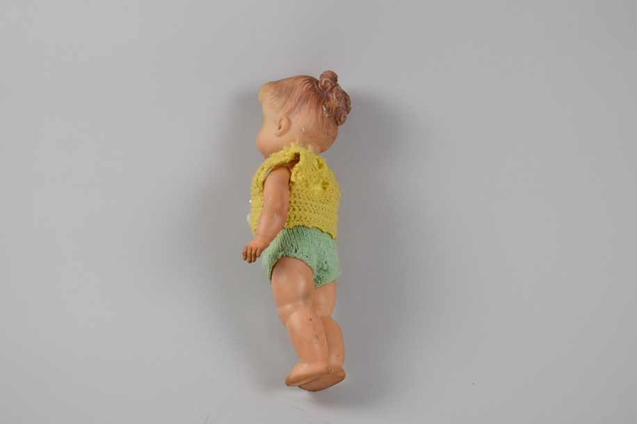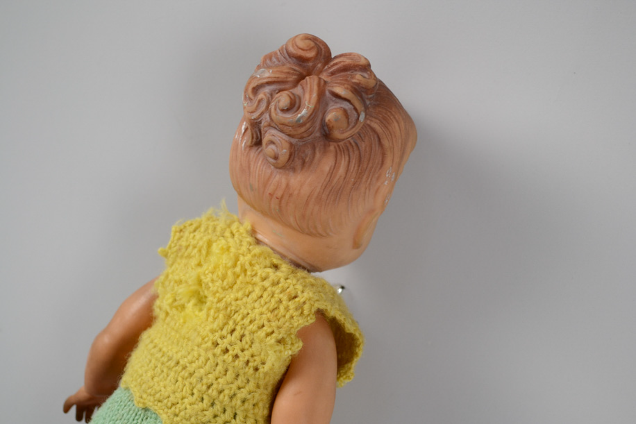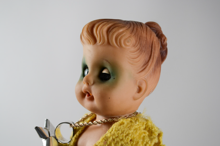 コケティッシュな彼女はソフトビニール製。輸出用でしょうか?日本人です。片目はウインクしたまま。おしゃれな彼女は自分に似合う色を知っていて、首元には母親譲りのMargiela Ring(2008年)のリングが光ります。お揃いのシルバーのネックレスにトップとして通して堂々とキメています。