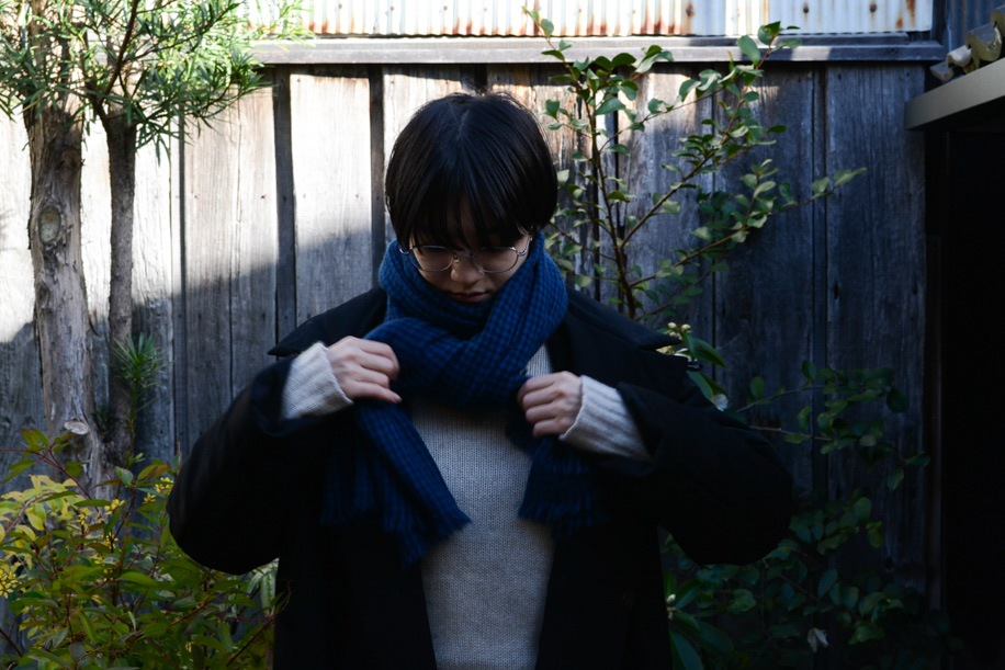 巾広で広げると肩に掛けられるサイズ。そして折って巻けばコンパクトになり、首回りはもたつかず、すっきりと収まり良く巻けるストール。このサイズでも軽く、ボリュームも出すぎずにスッキリまとまるのはカシミヤならでは。カシミヤの糸は超極細の単糸をたっぷりと使用。見た目のボリューム以上に薄手で軽くて柔らかなのはそのためです。